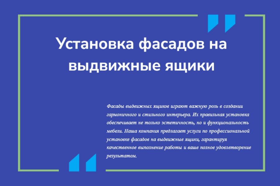 Фасады выдвижных ящиков играют важную роль в создании гармоничного и стильного интерьера. Их правильная установка обеспечивает не только эстетичность, но и функциональность мебели. Наша компания предлагает услуги по профессиональной установке фасадов на выдвижные ящики, гарантируя качественное выполнение работы и ваше полное удовлетворение результатом.